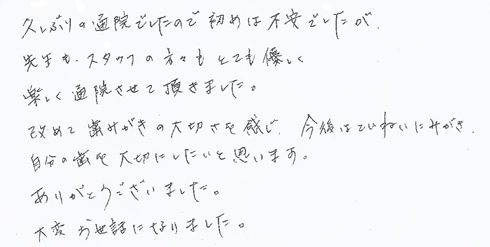 再指導を行いました。いつも笑顔で来院くださり、安心感ある患者さんでした。