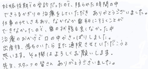 妊娠性歯肉炎を起こさないよう、清掃指導や歯周治療も行いました。